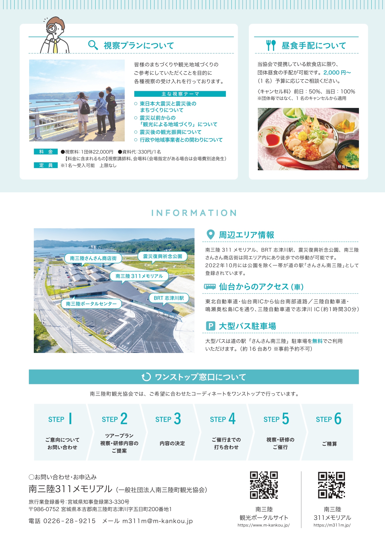 南三陸311メモリアルでは、有料のラーニングプログラムに加え、皆様のまちづくりや観光地域づくりのご参考にしていただくことを目的に、視察プログラムの提供を行っております。