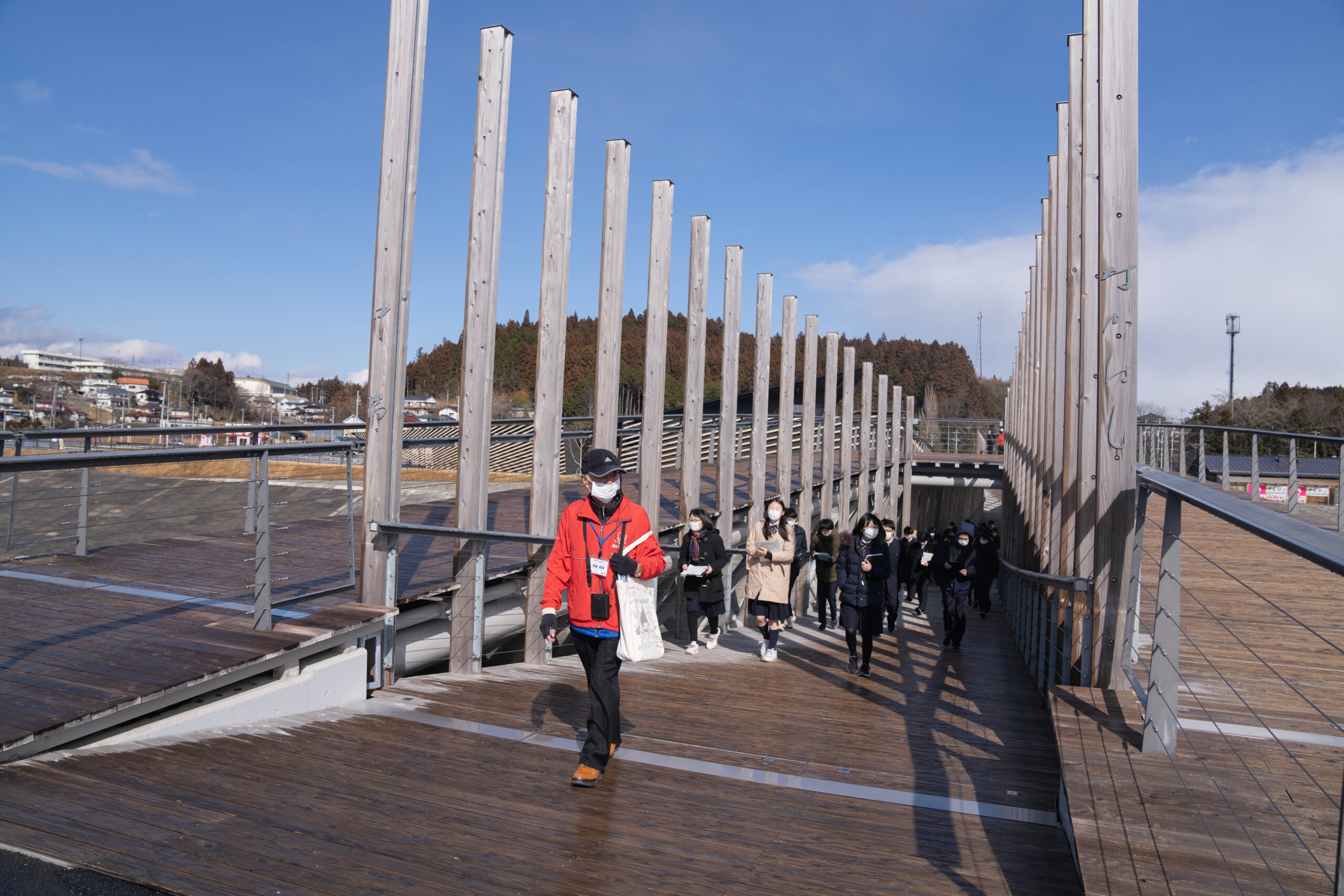 その後、旧防災対策庁舎のある震災復興祈念公園へ向かいました。プログラム2で、南三陸町は震災後に土を盛り、町の至る所をかさ上げしたという話が出てきます。今では、311メモリアルなどの施設がある場所から、見下ろせる場所にある旧防災対策庁舎。ここが震災前の町の高さだということを実際に歩いて感じてみます。プログラムの証言だけでは想像できなかった震災後のまちづくりや防災への考え方を、より深めることができたようでした。