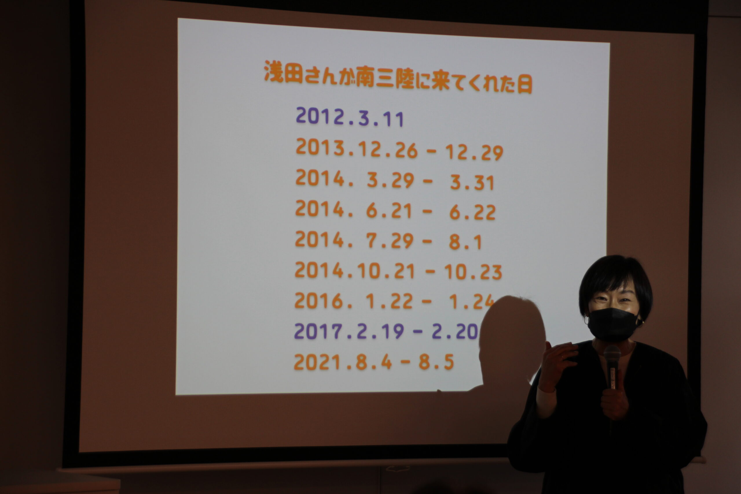 最初に、イベントのコーディネーターを務めた吉川由美さん(「みんなで南三陸」プロジェクトディレクター)から、浅田さんが南三陸町に関わることになった震災後の最初の追悼式の話が紹介されました。