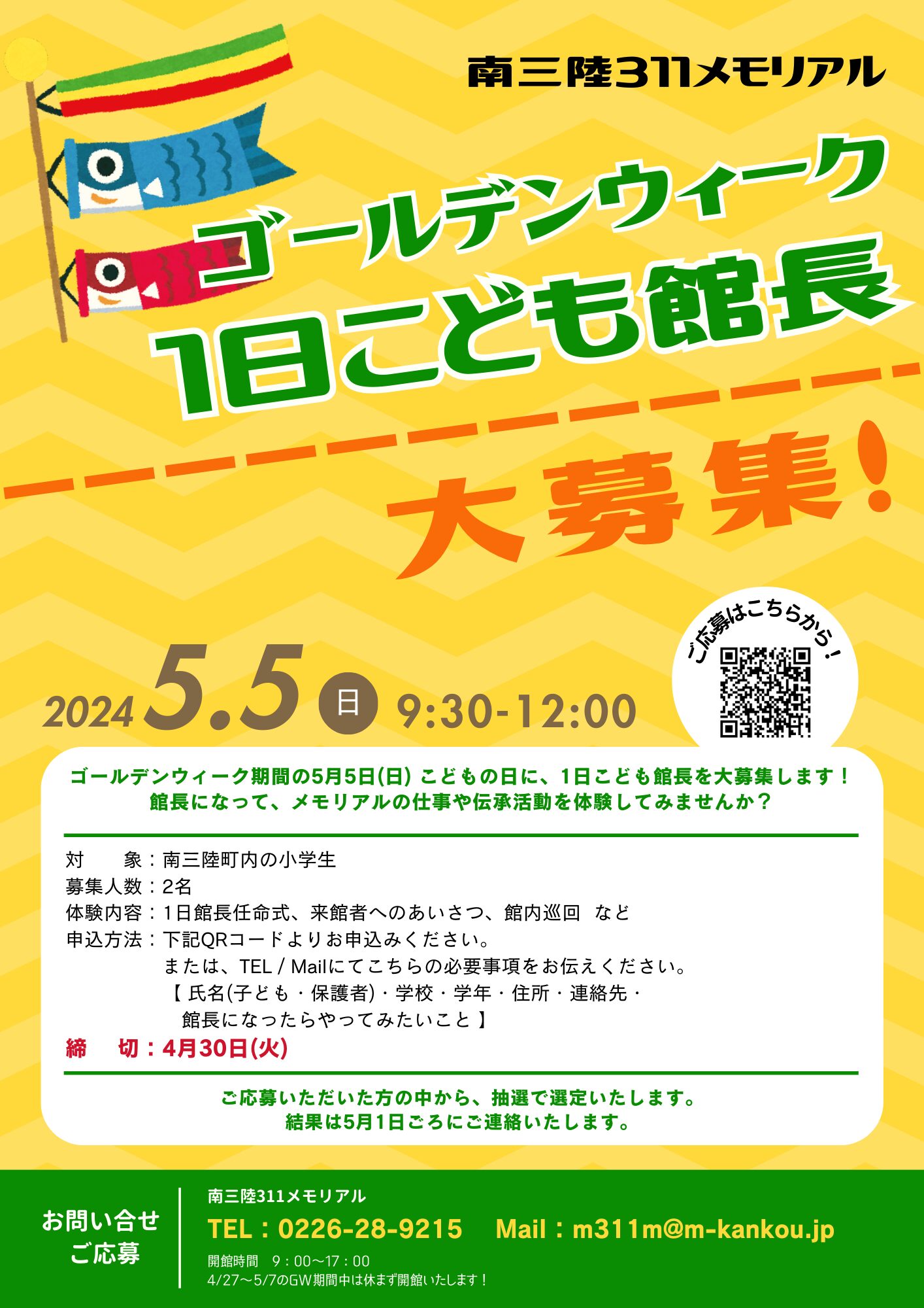 南三陸311メモリアルでは、ゴールデンウィーク中の特別企画として、1日こども館長を大募集します!