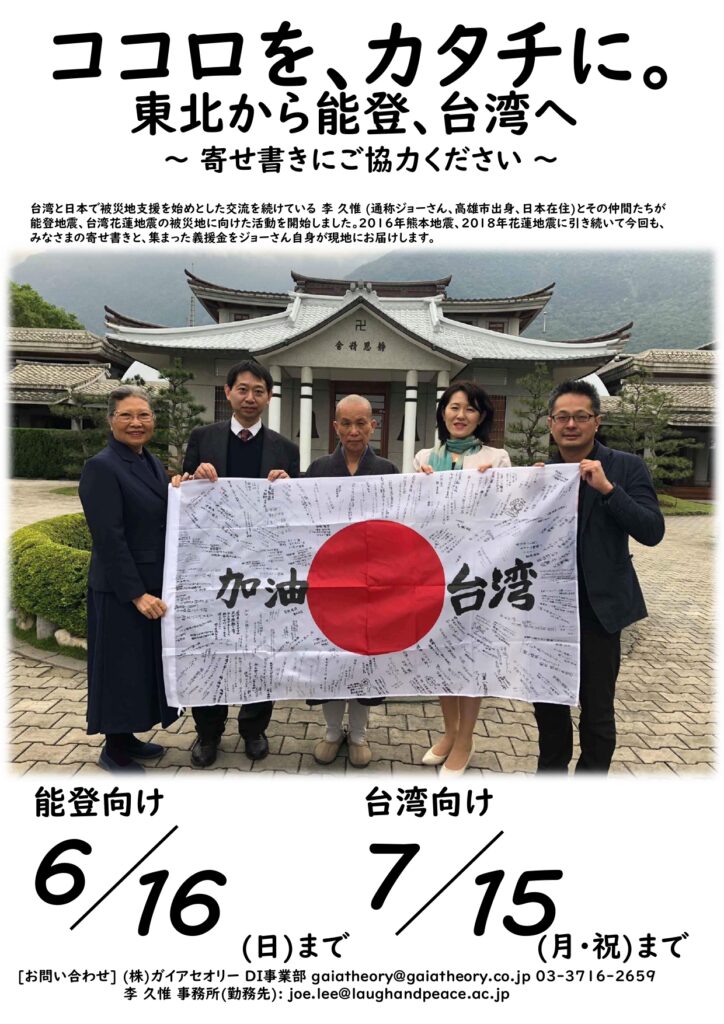 2024.05.27 お知らせ 〈終了しました〉【ご協力ください】ココロを、カタチに。能登・台湾へのメッセージ寄せ書きのお願い 南三陸311メモリアルでは、能登半島地震被災地および台湾花蓮地震被災地に向けて、寄せ書きの呼びかけを行っています。 寄せ書きについて=================== <能登向け> 5月27日(月) ~ 6月16日(日) <台湾向け> 6月17日(月) ~ 7月15日(月) <場所> 館内エントランス ================================ 今回の呼びかけは、台湾出身で日本在住の 李久惟さんが発起人となり始まりました。お寄せいただいたメッセージは、李さん自身が被災地へ持ち込みます。 館内エントランスでご記入いただけますので、ご来館の際にはぜひご協力ください。