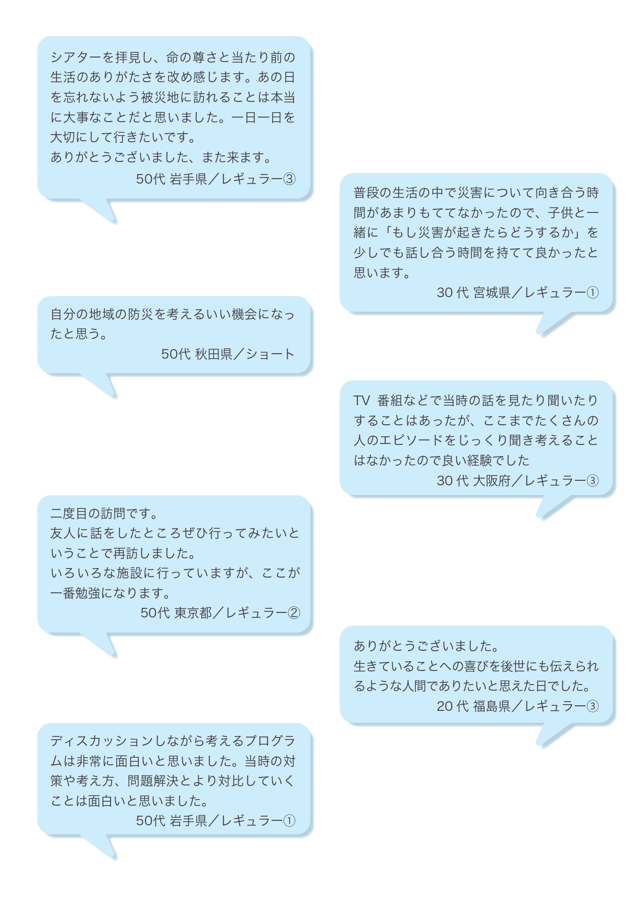 2024.05.01 アンケート 【4月アンケートより】お客様の声 南三陸311メモリアルでは、毎月ご来場いただいたお客様を対象に、アンケートを実施しております。 2024年度4月にご回答いただいたアンケートより、お客様にいただいたご意見・ご感想をご紹介いたします。 =========================================================== 実施期間:2024年4月1日(月)~4月30日(火)/開館24日間 ===========================================================