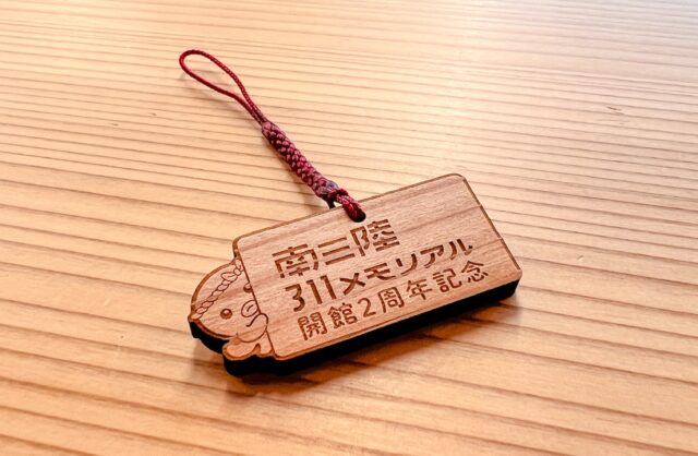 地元名産の南三陸杉でつくったオリジナルキーホルダーです!南三陸でがんばる人を応援するキャラクター「オクトパス君」がひょこっと現れて、2周年をお祝いしてくれています。