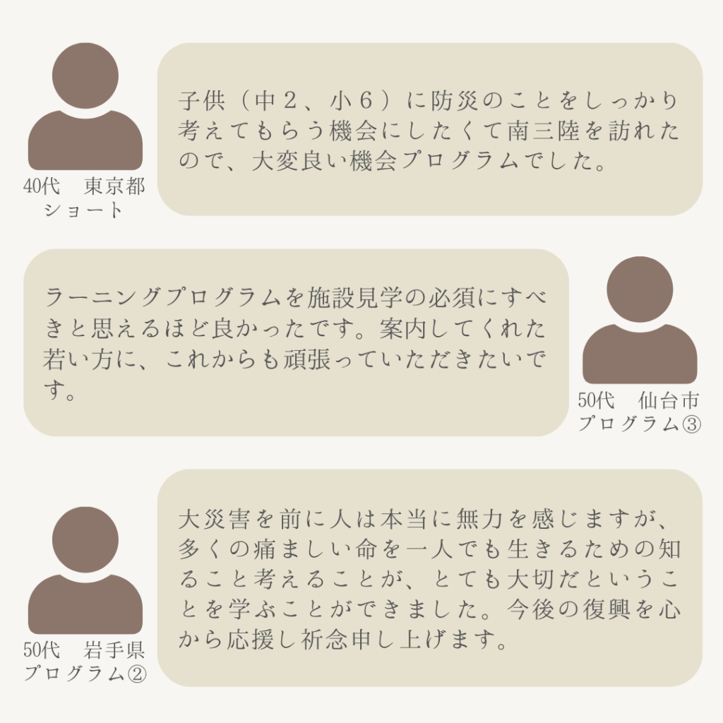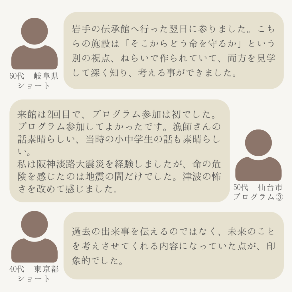2024.10.03 アンケート 【9月アンケートより】お客様の声 南三陸311メモリアルでは、毎月ご来場いただいたお客様を対象に、アンケートを実施しております。 2024年度9月にご回答いただいたアンケートより、お客様にいただいたご意見・ご感想をご紹介いたします。 ============================== 実施期間:2024年9月1日(日)~9月30日(月) ==============================