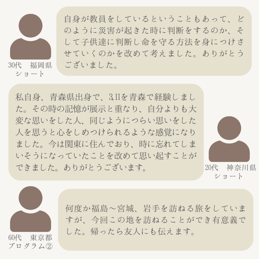 2024.11.20 アンケート 【10月アンケートより】お客様の声 南三陸311メモリアルでは、毎月ご来場いただいたお客様を対象に、アンケートを実施しております。 2024年度10月にご回答いただいたアンケートより、お客様にいただいたご意見・ご感想をご紹介いたします。 ============================== 実施期間:2024年10月2日(水)~10月31日(木) ==============================